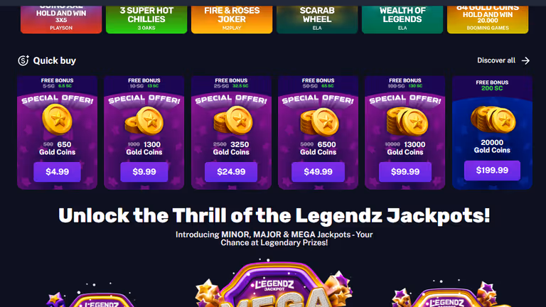 With over 500+ games in their library, Legendz definitely doesn't skimp on variety. They've partnered with some solid game providers like Pragmatic Play, Hacksaw Gaming, and BGaming - all names you've probably seen if you've been around sweepstakes casinos for a while.